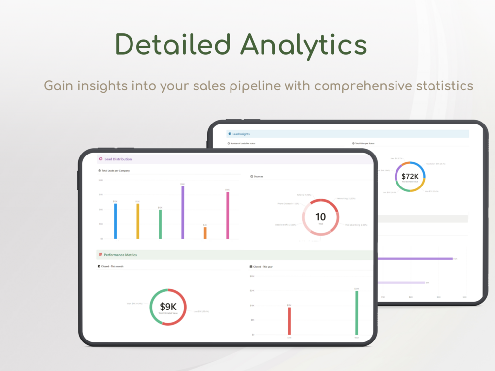 Get a clear overview of your sales performance with detailed, visually engaging graphs and charts. This statistics page allows you to track lead conversion rates, deal progress, and team performance. Whether you’re analyzing sales trends, measuring individual sales performance, or reviewing team-wide metrics, this data visualization provides actionable insights to guide decision-making.