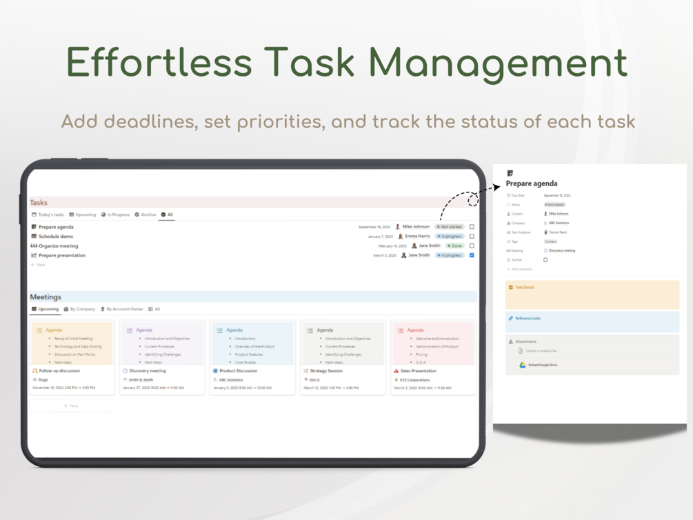 Never miss an important meeting again with the built-in Meetings section. Schedule, track, and manage all upcoming meetings directly from the template. Each meeting can be linked to relevant leads, companies, or contacts, ensuring full context during discussions. The streamlined design keeps you organized, helping you stay prepared for client calls, presentations, or internal meetings.
