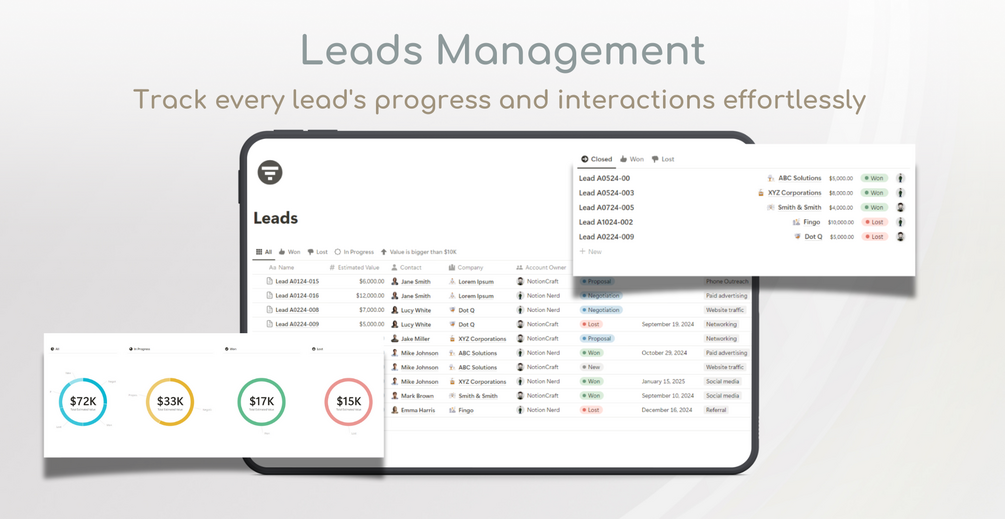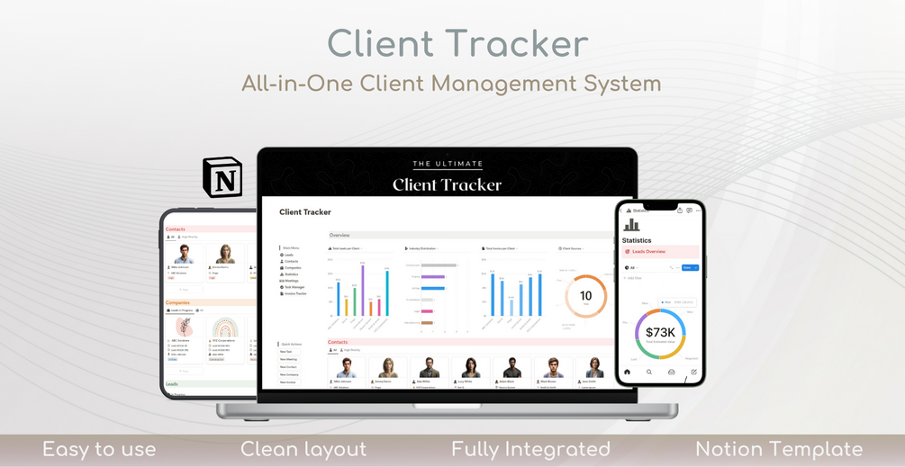 The Ultimate Client Tracker is a powerful Notion template designed to simplify and streamline the entire client management process. Whether you're tracking leads, managing contacts, organizing invoices, or monitoring team performance, this Notion template provides everything you need in one intuitive workspace. Ideal for businesses of all sizes, it offers a structured approach to stay organized and drive productivity while giving you deep insights into your operations.
